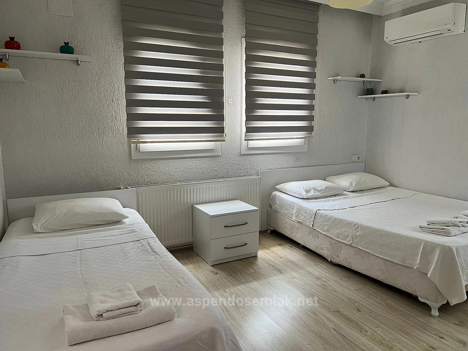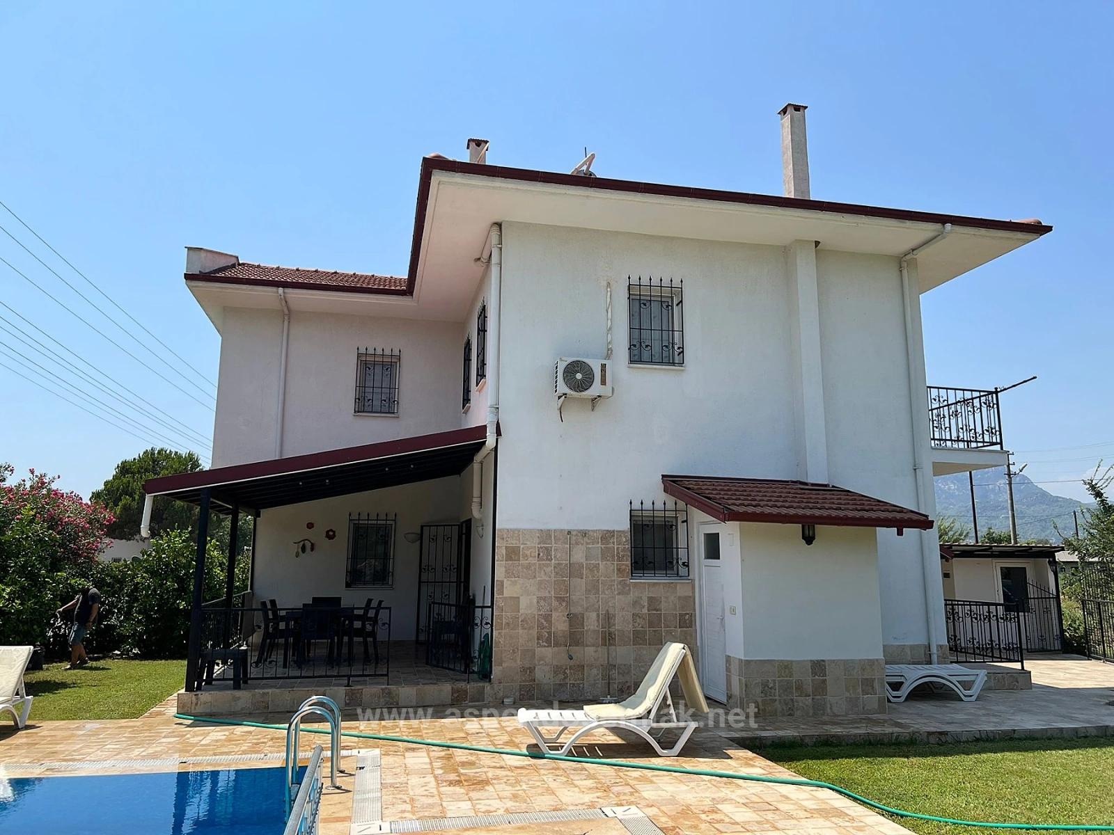 A 3+1 villa with a pool is for sale in Dalyan, on a corner plot of 600m2. The ground floor has a living room with open kitchen, sink and toilet, and the second floor has 3 bedrooms and 1 shared bathroom. One bedroom has an en-suite bathroom. Each room is air-conditioned. There is a heat pump central heating system. It is fully furnished. It has a private entrance and a storage room, sink-toilet and covered parking space in the garden. There is a children's pool.