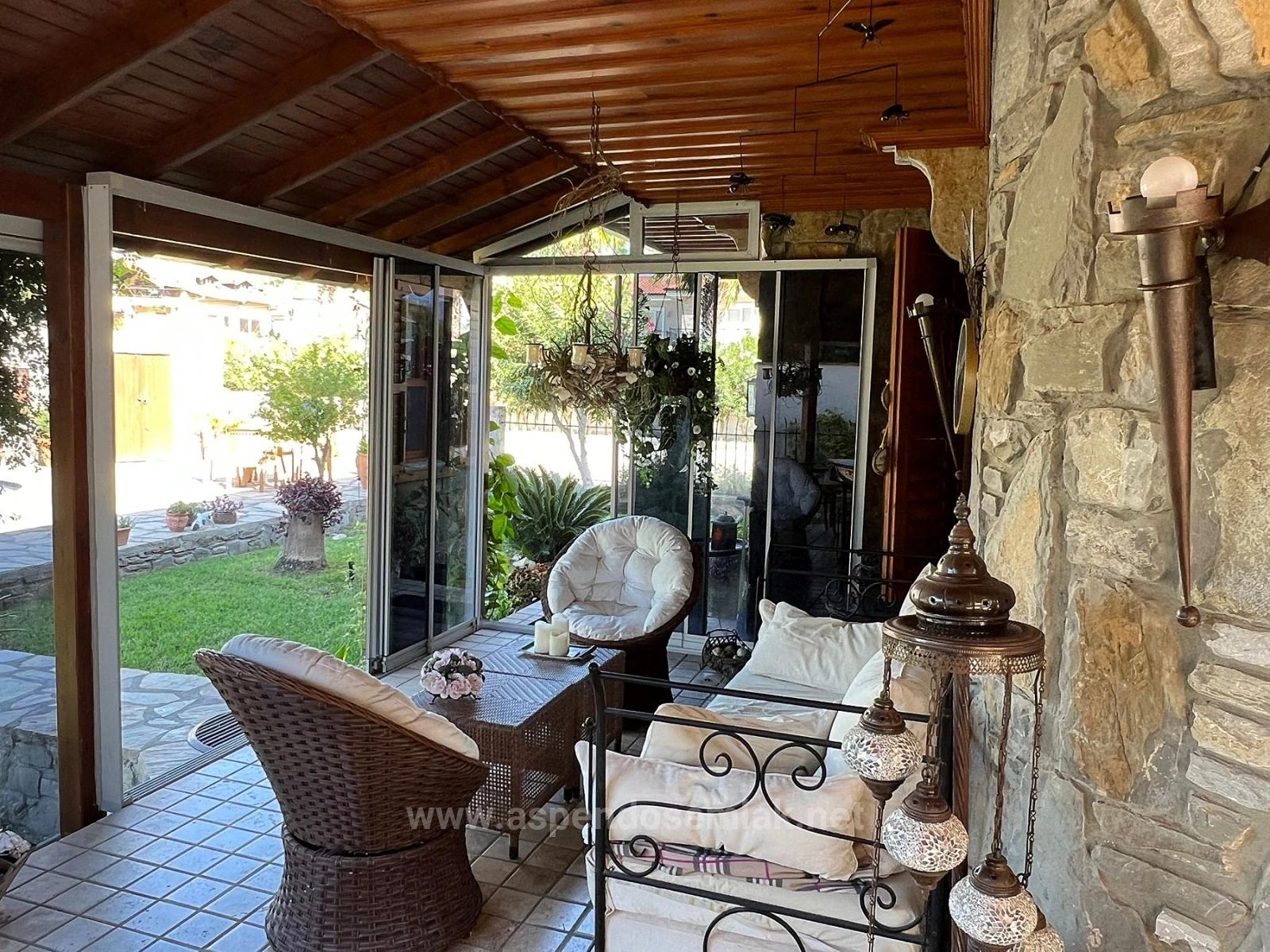 A detached stone villa is for sale on a corner plot of 580m2 in the Gülpınar area of Dalyan. It has an unobstructed view of a green area. The main building has 4 bedrooms, a large living room with an open kitchen, 3 bathrooms, 3 balconies, and a large terrace. Each room is air-conditioned. It is fully furnished. The villa is entirely constructed of natural stone with predominantly wooden workmanship. Visually, it is very stylish and in keeping with the region. It has a 45m2 outdoor swimming pool with a saltwater system. There is also a separate 1+0 bathroom and approximately 50m2 of living space. Additionally, there is a pool storage area and a storage room for materials. The villa has been recently renovated and requires no further investment. It is within walking distance of shopping markets, 10km from Iztuzu Beach, and 25km from the airport. The villa offers nature and forest views. The price is: 500,000 GBP